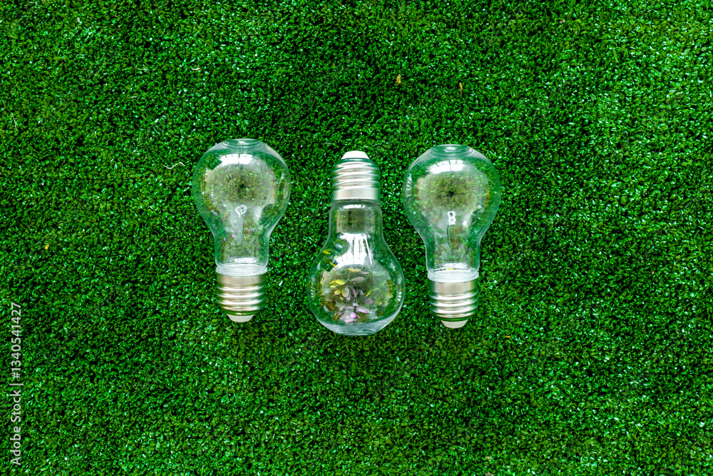 Light bulb with green plant, top view. Eco renewable energy concept.