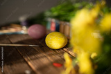 Table with paint and brush for painting easter eggs