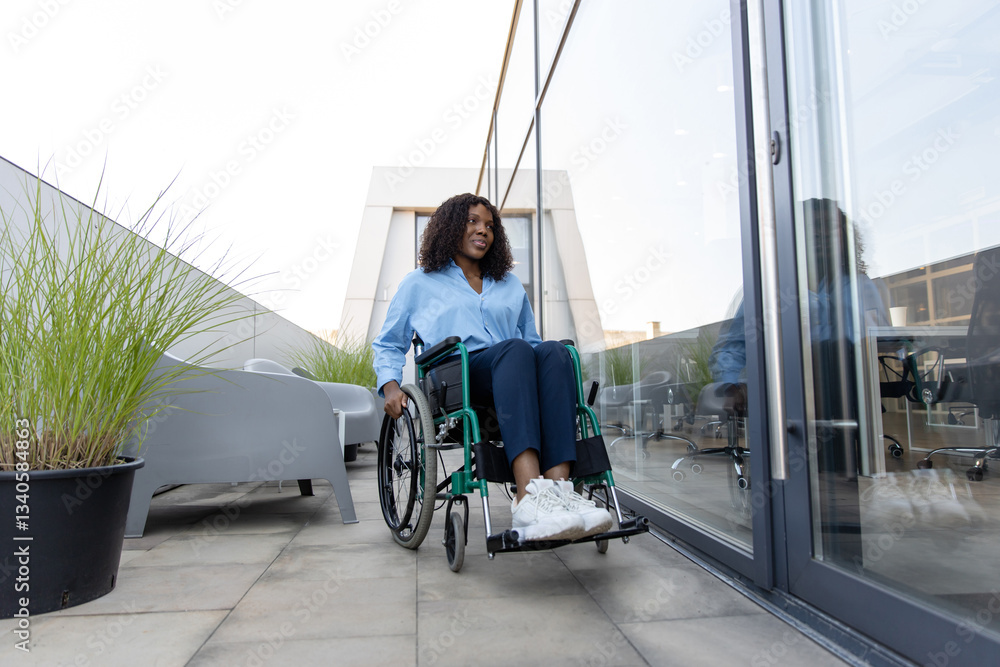 Dark-skinned young smiling disabled woman in a wheelchair near the office building