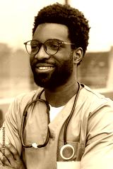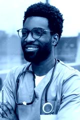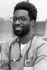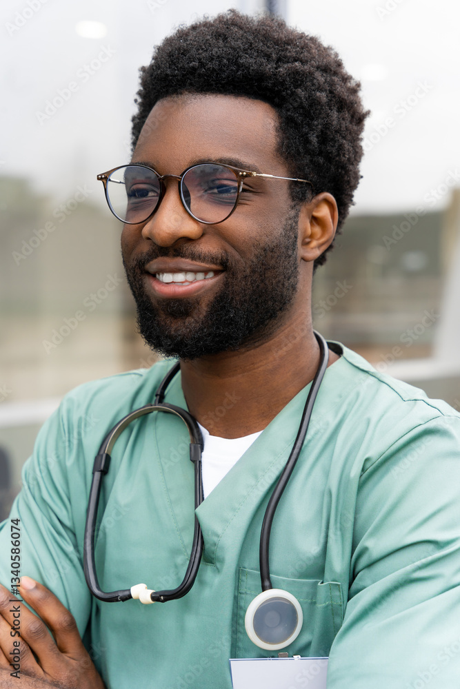 African American doctor wearing uniform standing in hospital office
