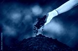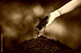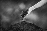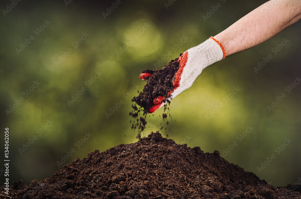 Hand pouring black soil on green bokeh background. Planting a small plant on a pile of soil or pouring soil during funeral. Gardening backdrop for advertising.
