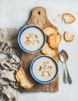 Creamy mushroom soup in bowls with toasted bread slices on rustic serving board over grey marble background, top view, selective focus