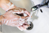 A man washes his hands with soap in the bathroom. Personal hygiene. Disinfection and precautions during a pandemic