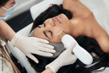 The beautician at the salon performs a facial cleansing treatment for a young female client using specialized equipment