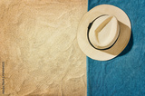 Top view of sandy beach with towel frame and summer accessories. Background with copy space and visible sand texture. Right border made of towel