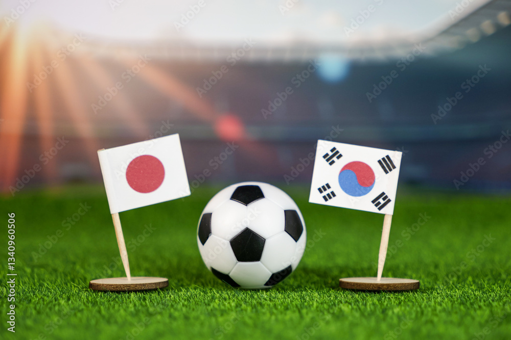 japan vs south korea football match with flags, soccer ball on green field, and blurred stadium, symbolizing asian sports rivalry and teamwork