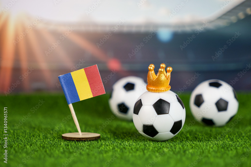 romania football scene with national flag, crowned soccer ball on green field, and blurred stadium, symbolizing sports success and national pride