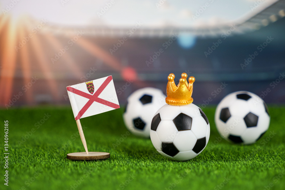 jersey football scene with national flag, crowned soccer ball on green field, and blurred stadium, symbolizing sports excellence and regional pride