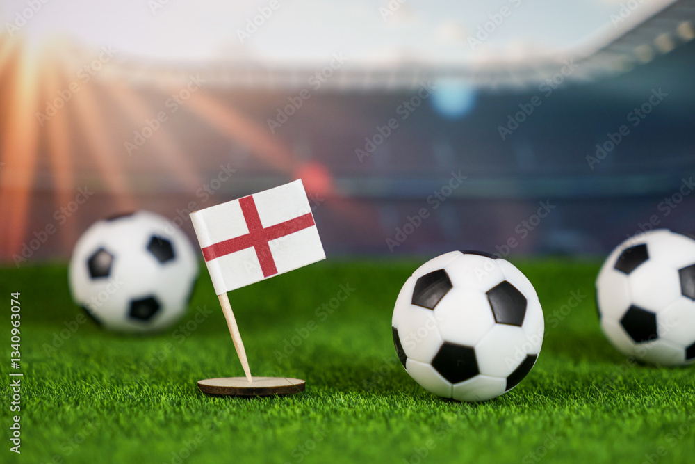 england flag on football field with soccer balls, green grass, and stadium, symbolizing national pride, sports heritage, and competitive spirit