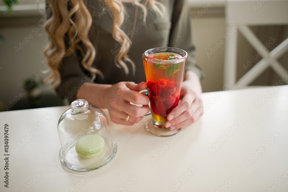The girl sits at a little table of cafe.