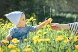 happy infant baby sitting on a green grass field, girl sits on a spring meadow,