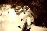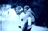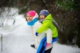 Beautiful young woman bears on the son's shoulders through snowdrifts.