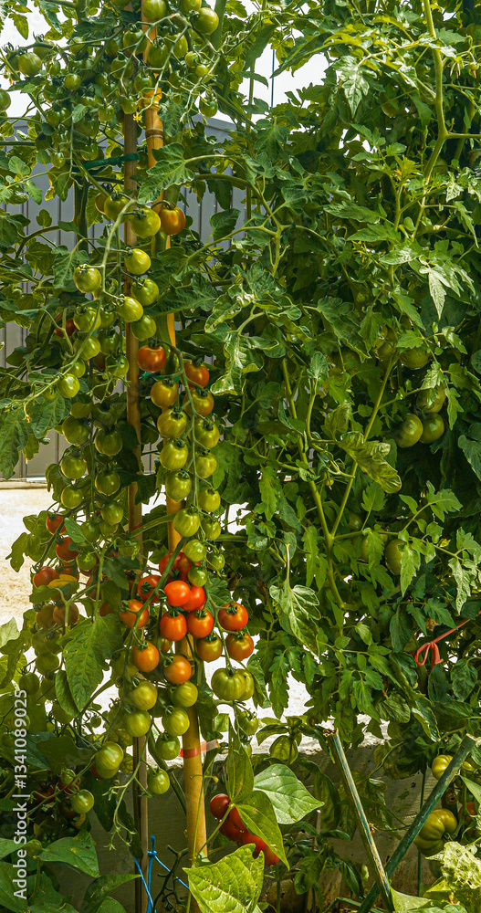 CLOSE UP: Lush tomato plant with clusters of cherry tomatoes ripening on the vine, transitioning from green to vibrant red. Vegetable plant is supported by wooden stake, thriving in an organic garden.