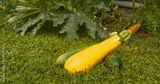 CLOSE UP: Homegrown harvested yellow and green zucchinis nestled on grass next to lush vegetable plant. Natural light highlights texture and freshness of organic vegetables picked from home garden.