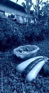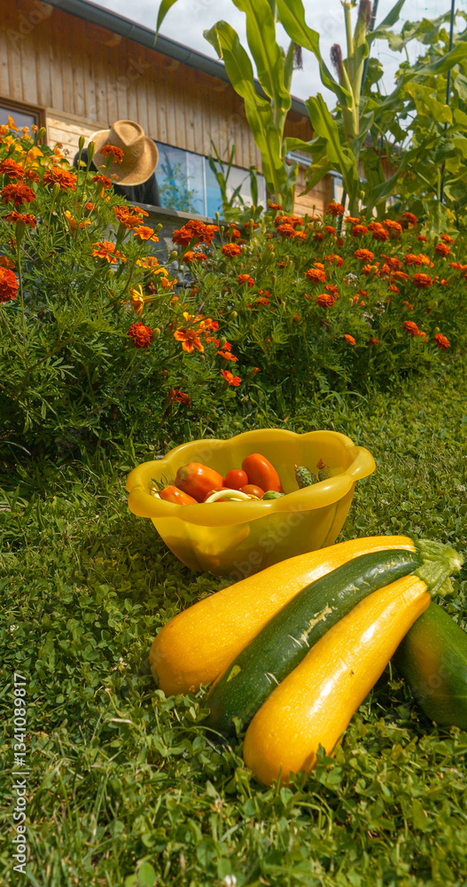Vibrant collection of freshly picked homegrown vegetables with working gardener in background. Yellow bowl is brimming with a selection of colourful summer veggies grown in home raised bed garden.
