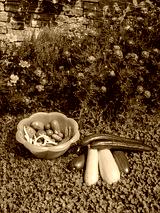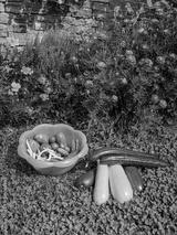 CLOSE UP: Assortment of freshly picked red tomatoes, cucumbers, yellow beans and zucchini. Collection of harvested vegetables displayed on lawn next to vibrant marigolds flowering in summer garden.