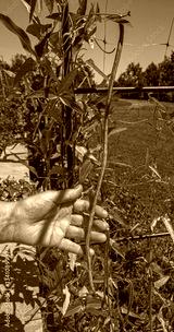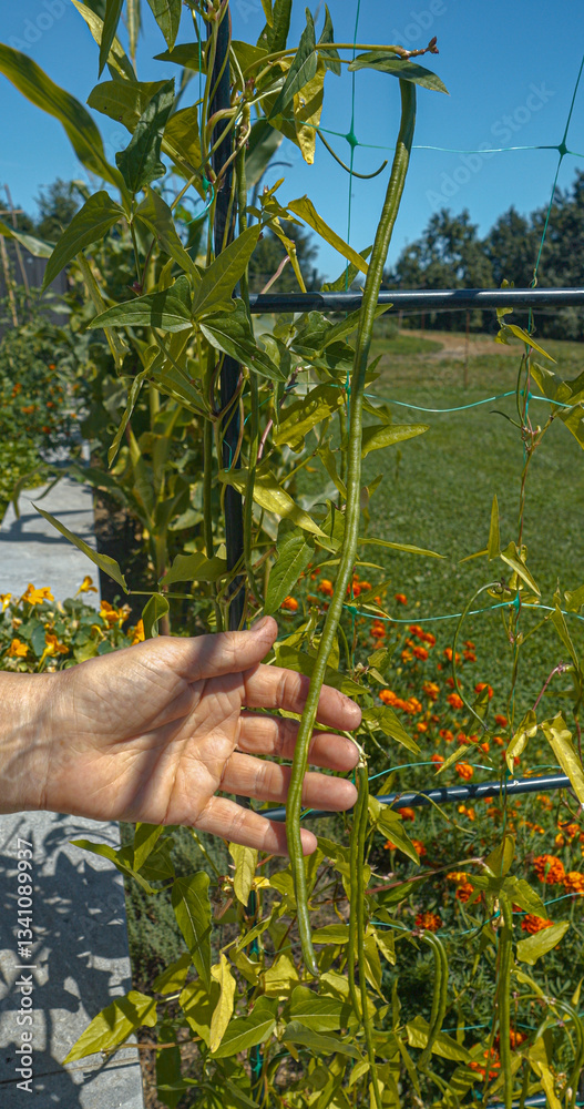 CLOSE UP: Unknown hand gently holds a homegrown yardlong bean still attached to the lush vine. Incredibly long bean pods hang down gracefully among the vibrant green leaves in a rural garden setting
