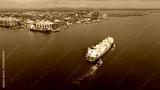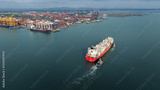 shipping container carrier container sailing enter commercial port, global business and industry delivery service of cargo logistics to import and export by ship freight transportation.