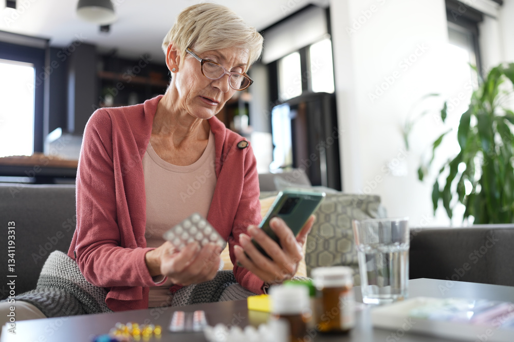 A senior woman wearing glasses sits in her living room, attentively looking at her smartphone while managing her medications.