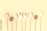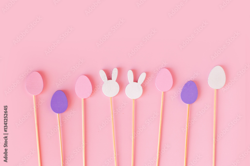 Easter frame composition with minimal style eggs and rabbit wood toys on pastel light pink background. Trendy composition, holiday concept. Flat lay, top view, place for text, card