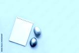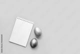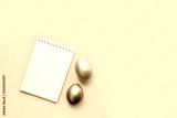 Flat lay with notebook mock up and colorful painted eggs on yellow background. Spring note trendy minimal holiday concept, place for text, logo, wishes. Empty space, list, mockup. Top view