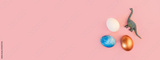 Easter egg hunt holiday composition, colorful eggs with dinosaur on light pastel pink backgroind. Seasonal spring kids game concept. Flat lay, top view, place for text, banner