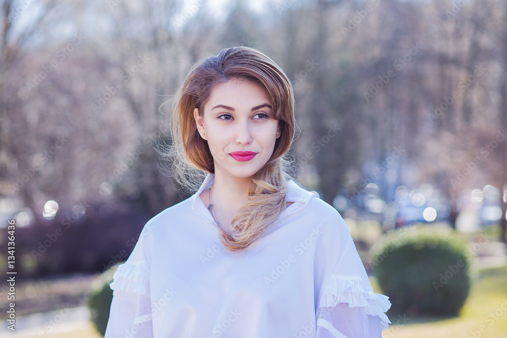 Portrait of woman smiling with perfect smile in a park outdoors background late autumn winter.
