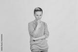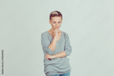 Woman thinking. Portrait close up of happy beautiful young woman thinking looking away, up isolated grey wall background with copy space. Human face expressions, emotions feelings, body language,