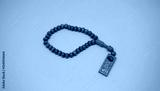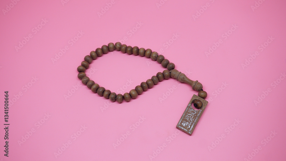 Wooden prayer beads on a pink background