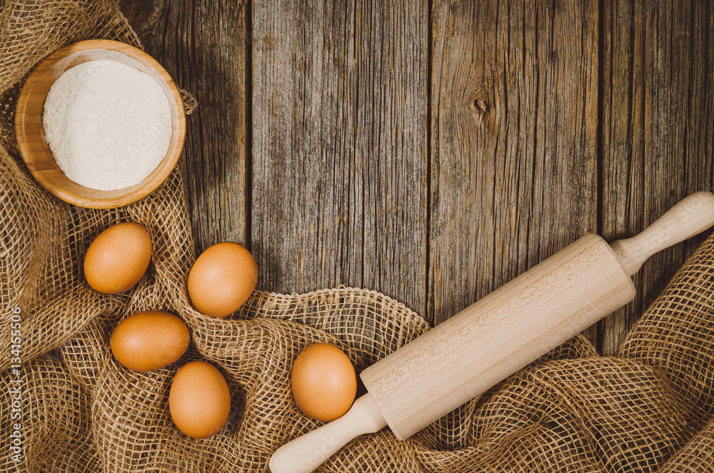 Baking or cooking ingredients background. Top view photograph with kitchen utensils on vintage, natural, raw, wooden background with visible texture.