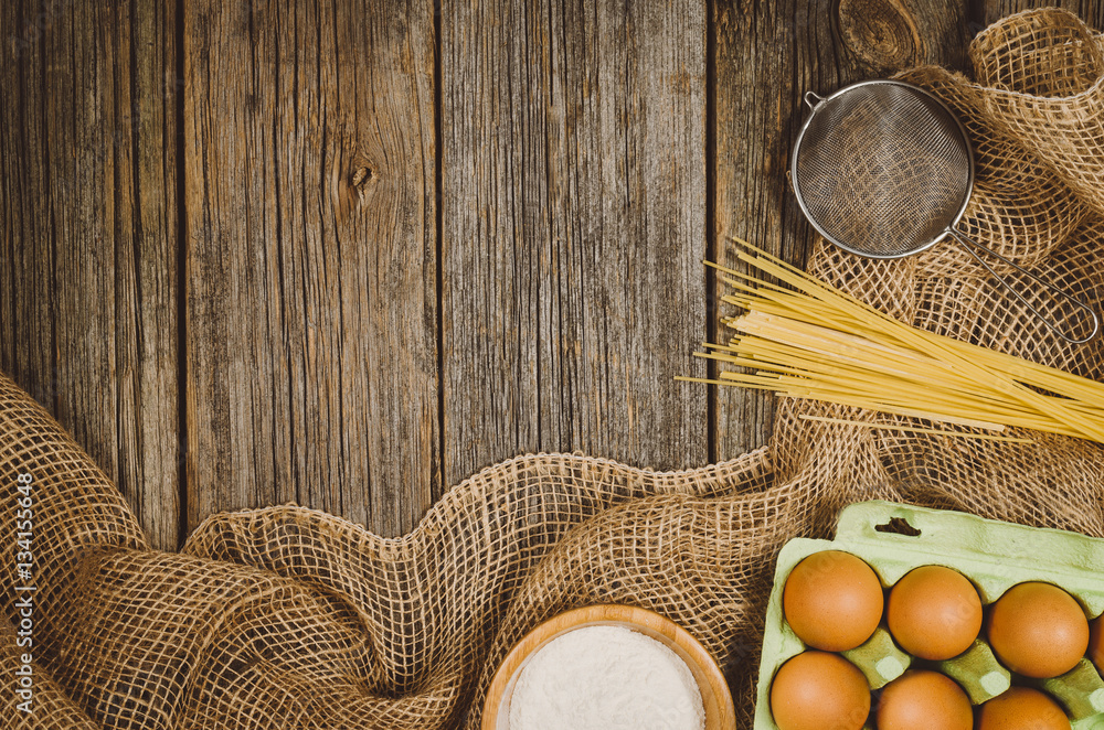 Baking or cooking ingredients background. Top view photograph with kitchen utensils on vintage, natural, raw, wooden background with visible texture.