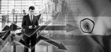 Outsourcing, onboarding and recruiting. India. Flag. Symbol of state power. Arrows with trails and directions. The concept of strategy or pluralism of opinions. A man in a business suit stands tall.