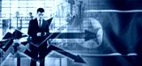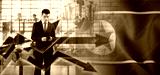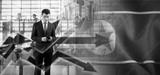 Outsourcing, onboarding and recruiting. North Korea. Flag. Symbol of state power. Arrows with trails and directions. The concept of strategy or pluralism of opinions. A man in a business suit stands