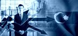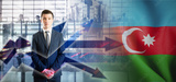 Outsourcing, onboarding and recruiting. Azerbaijan. Flag. Symbol of state power. Arrows with trails and directions. The concept of strategy or pluralism of opinions. A man in a business suit clasped