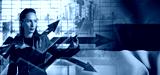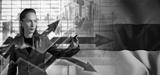 Outsourcing, onboarding and recruiting. Estonia. Flag. Symbol of state power. Arrows with trails and directions. The concept of strategy or pluralism of opinions. Woman in suit. Employee at work. Use