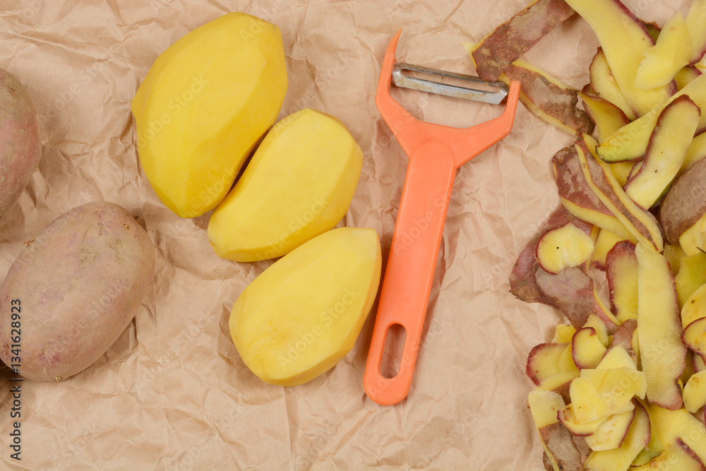 Peeled potatoes and potato peels with an orange potato peeler on brown paper