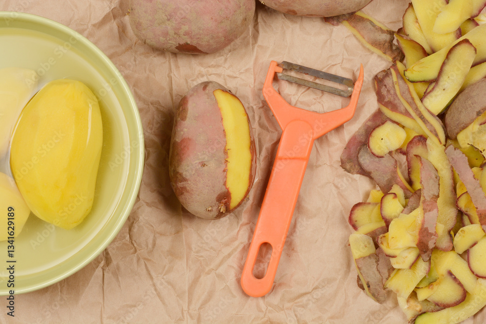 Peeled potatoes in a bowl of water, an orange potato peeler, and potato peels on brown paper