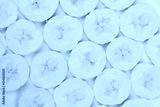 A close-up, top-down view of numerous banana slices arranged in a grid pattern