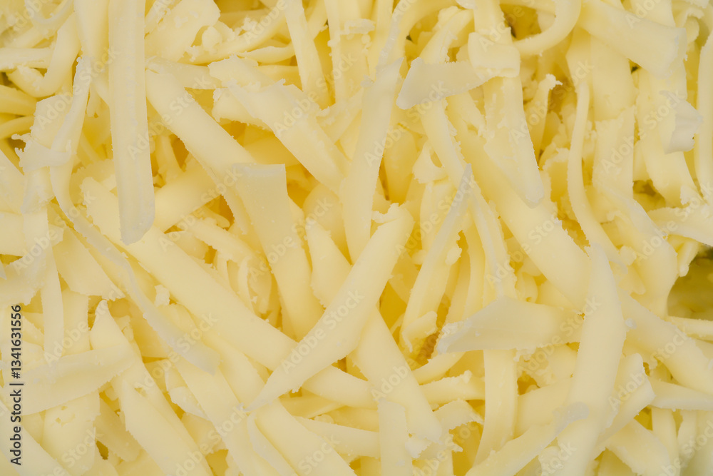 A close-up shot of shredded cheese, showcasing its texture and pale yellow color