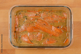 Carrot slices marinate in a clear glass container, preparing to become vegan salmon