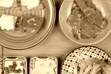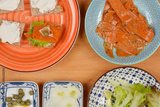 Ingredients for preparing vegan salmon carrot sandwiches are displayed on a wooden table with plates of sliced carrots, bread with cream cheese, and garnishes