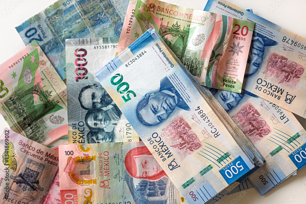 Stack of 500 Mexican Pesos bills on top of bills of another denomination