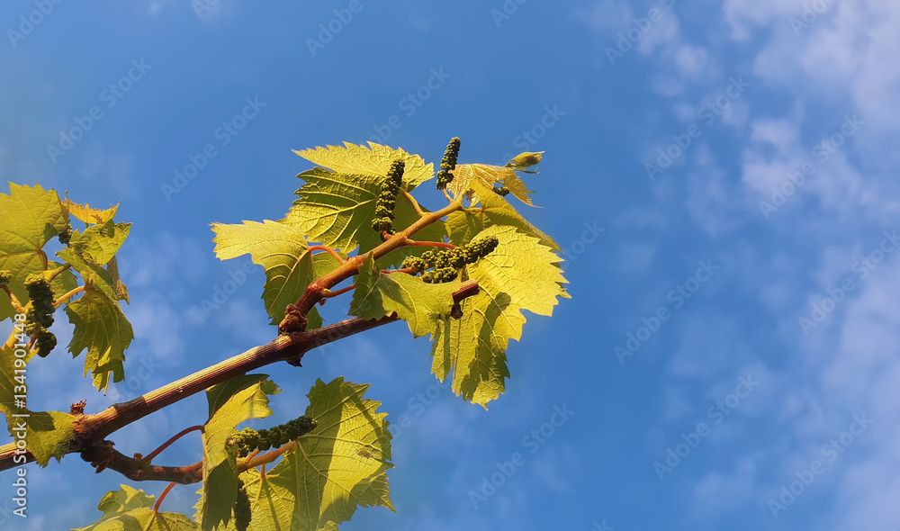 Growing vine twig, green leaves on hanging branches over blue sky background. New grapes buds before blooming in the vineyard.