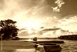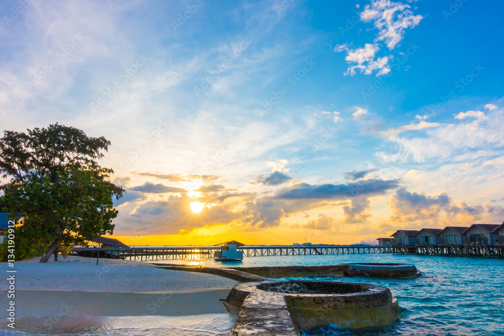 Beautiful sunrise with water villas in tropical Maldives islan