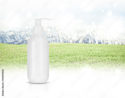 Cosmetic product for cream, foam, shampoo. on Panorama of Moun