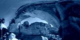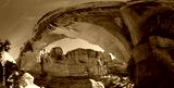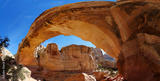 Wide angle view along a free standing natural sandstone arch. Hickman Natural Bridge, Capitol Reef National Park, Utah, USA. Navajo Sandstone formation, wide angle shot, July 2014
