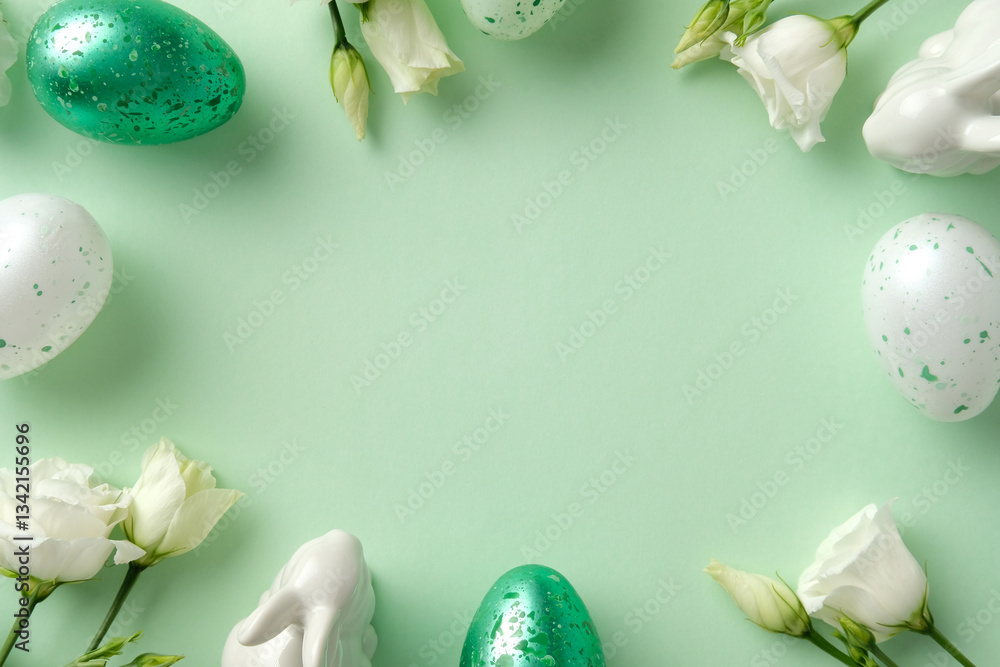 Pastel Easter flat lay: speckled eggs, delicate white flowers, and ceramic bunnies on green background