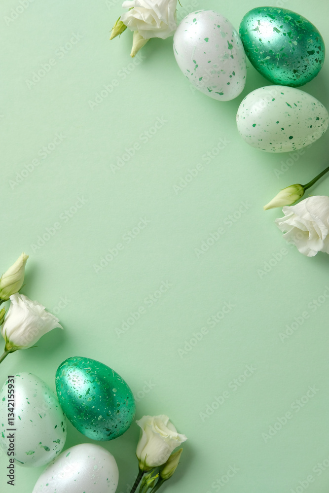 Happy Easter vertical background. Festive flat lay of green and white speckled eggs, ceramic bunnies, and white spring flowers on a pastel green backdrop