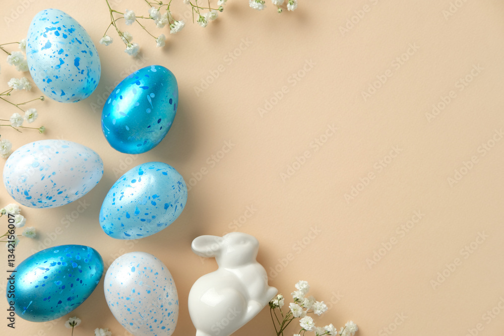 Easter composition. Blue and white speckled eggs, a ceramic bunny, and tiny white flowers on a beige background. Flat lay, top view.
