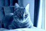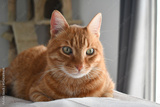 Ginger cat sitting on sofa. Happy tabby cat relaxing at home.